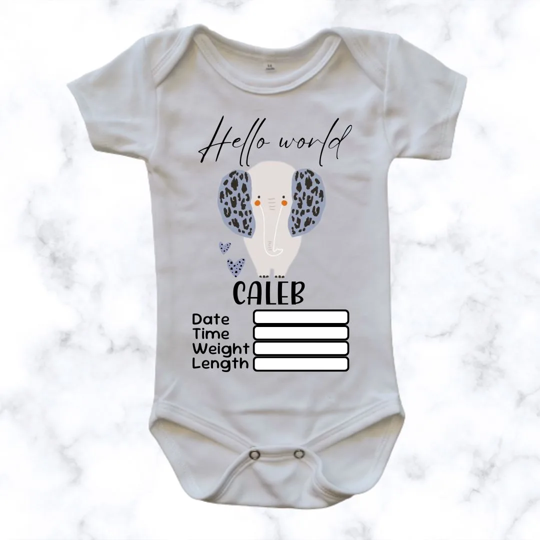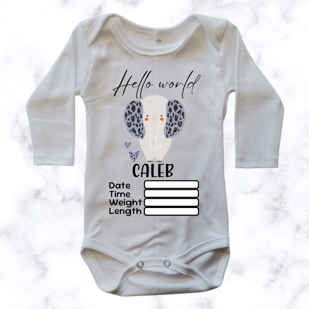 Each design features easy-to-fill blocks for writing in your baby’s birth details and is available in both short and long sleeve options. Theme: Elephant.