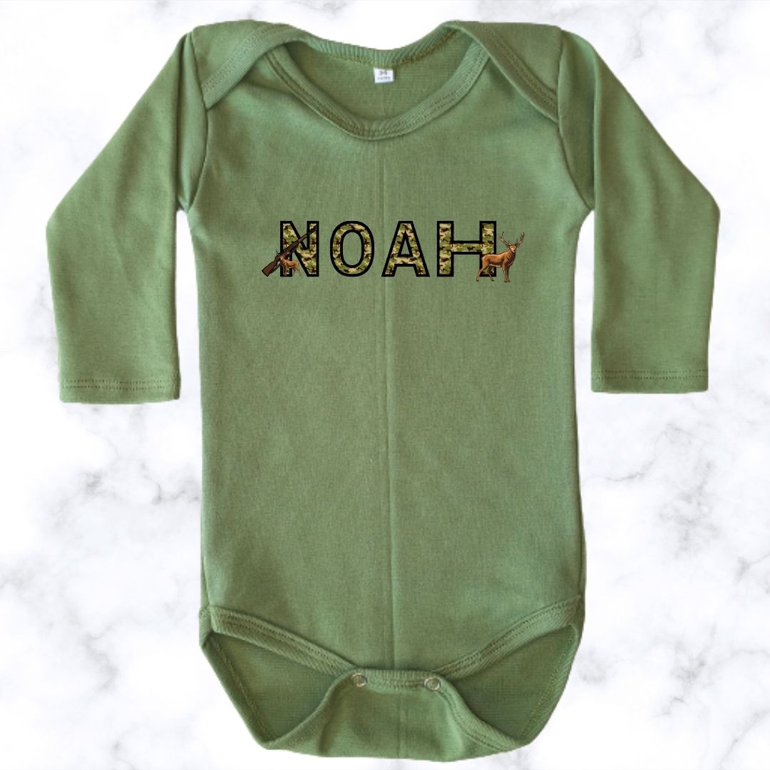 Our Camo Custom Baby Name | Printed Baby Onesie features a camo-inspired design personalised with your baby’s name. It is a fun and special outfit for everyday wear, gifting, or baby photos.