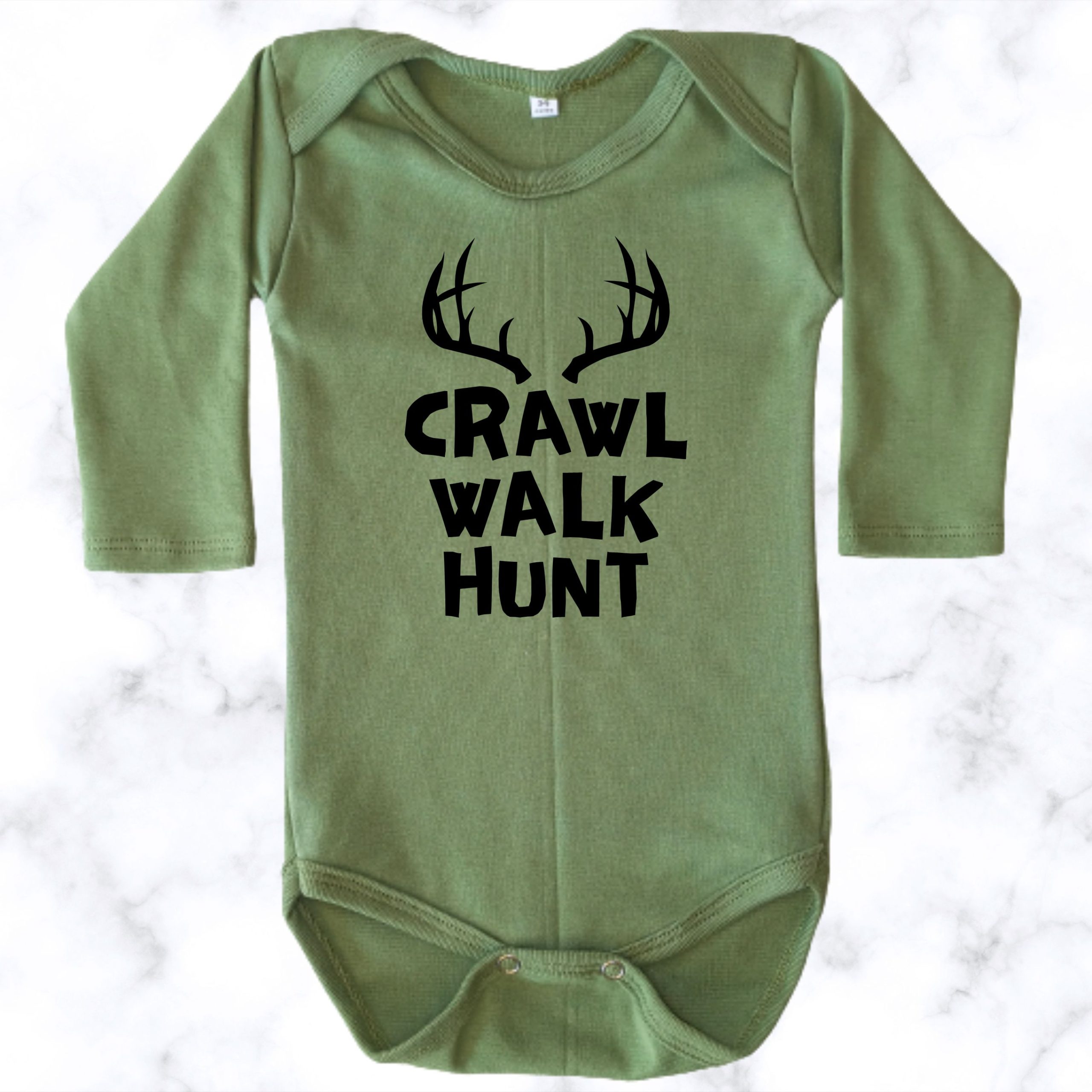 This cute baby onesie features the words Crawl Walk Hunt on the front. As a result, it is a fun choice for families who love the outdoors.