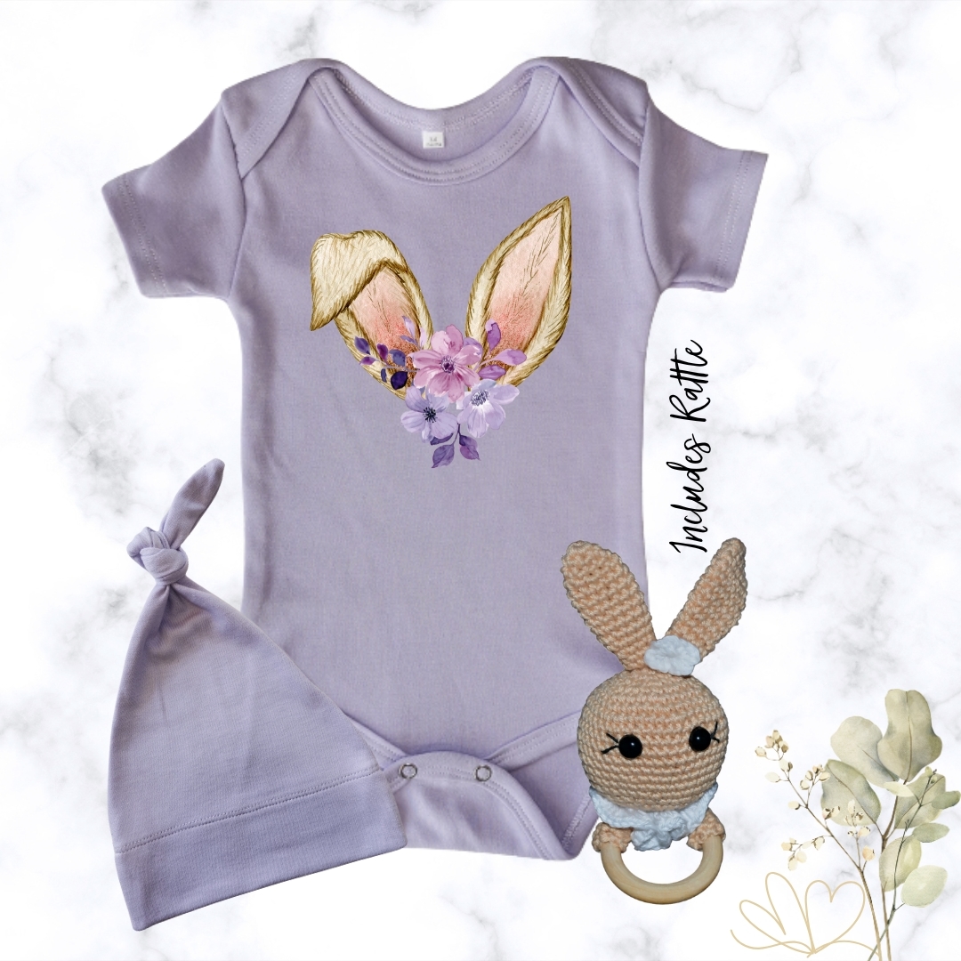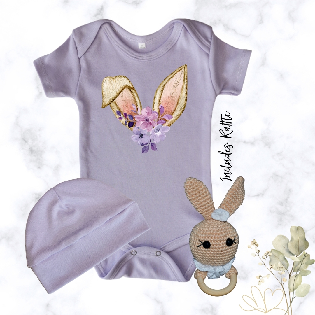 A long sleeve lavender Hello Little Bunny printed baby onesie with a bunny teether/rattle and beanie included. Soft cotton, photo-ready, and Ready to Collect or Ship.