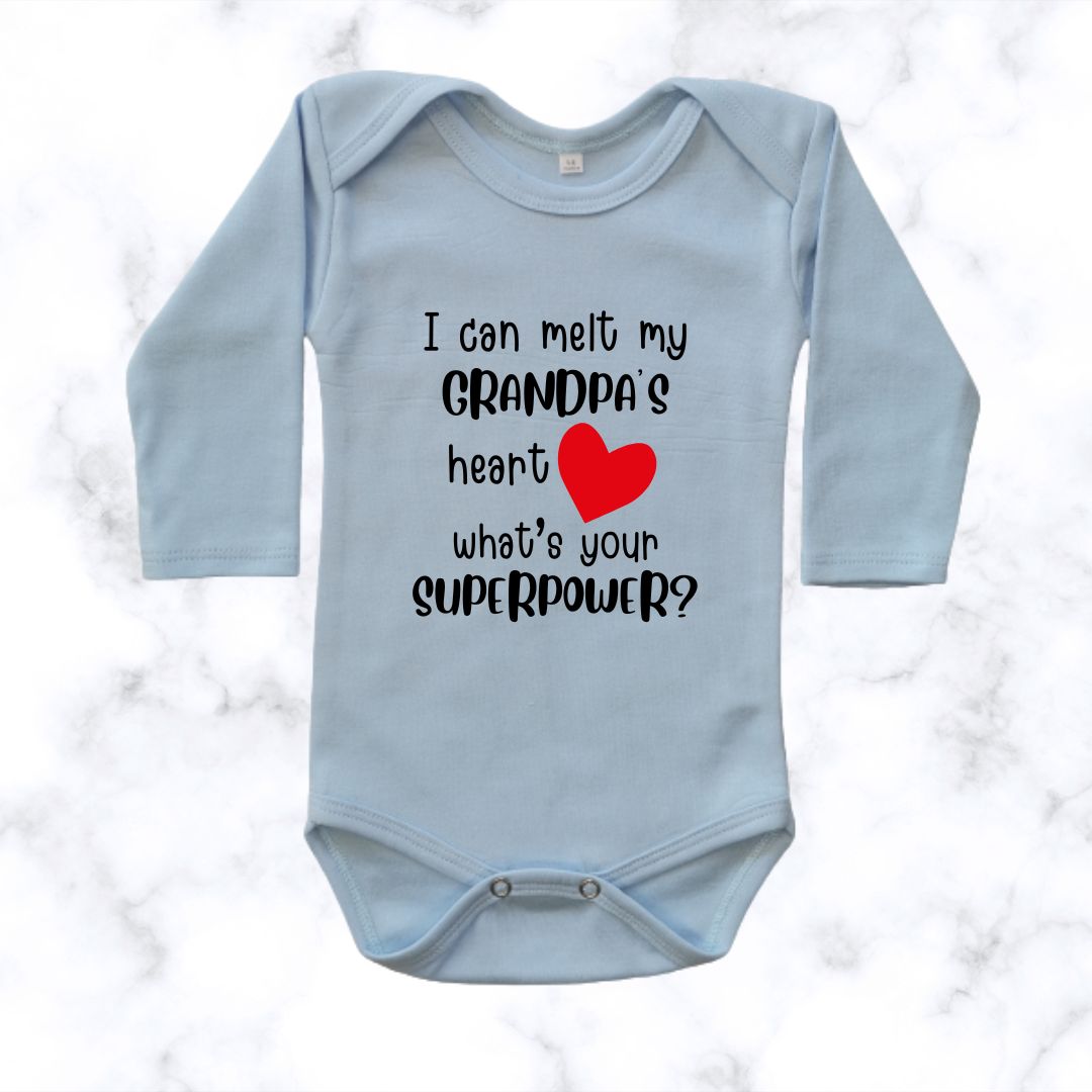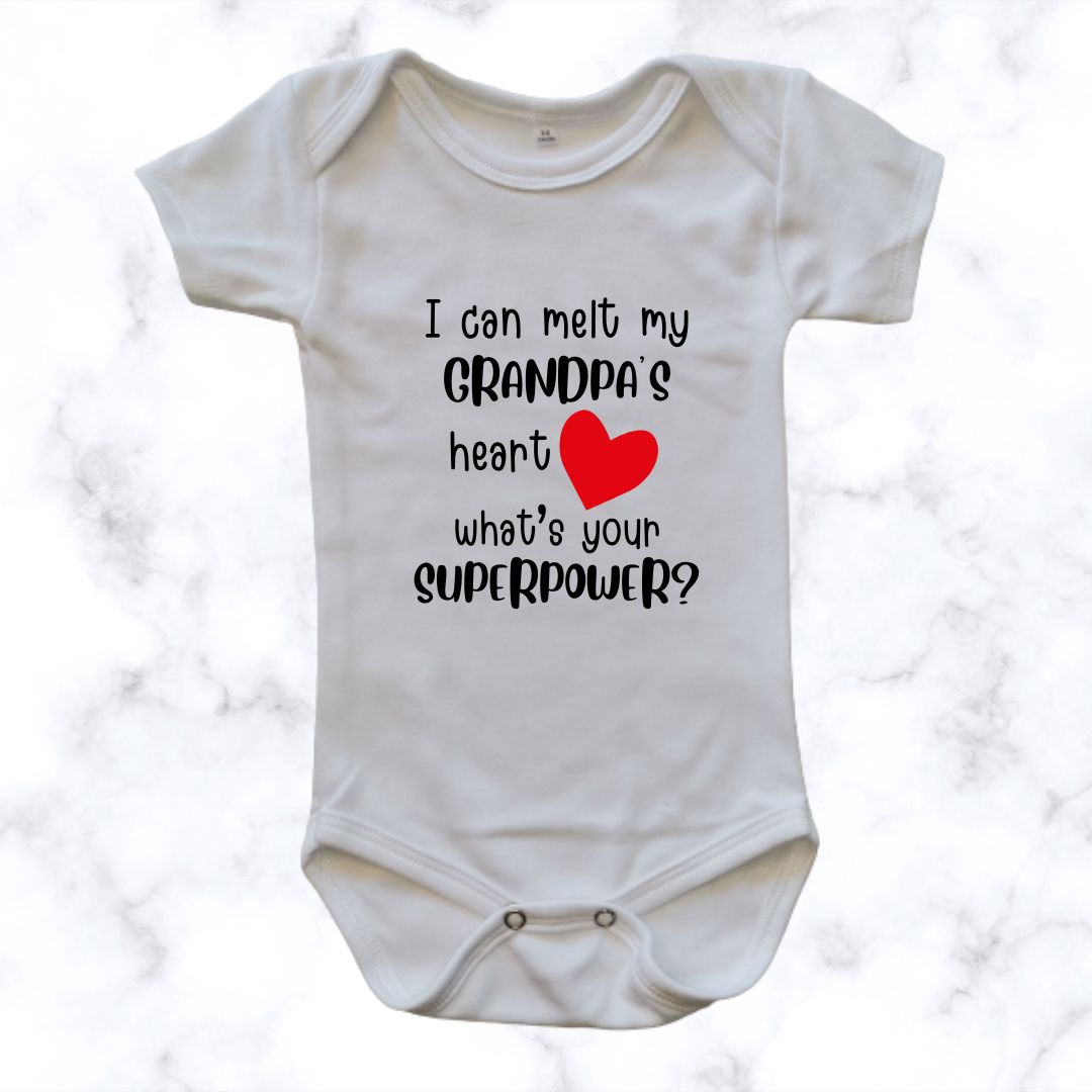 There’s nothing sweeter than a baby wearing I can melt my Grandpa’s heart | Custom Printed Onesie. This shows off their love for Grandpa!
