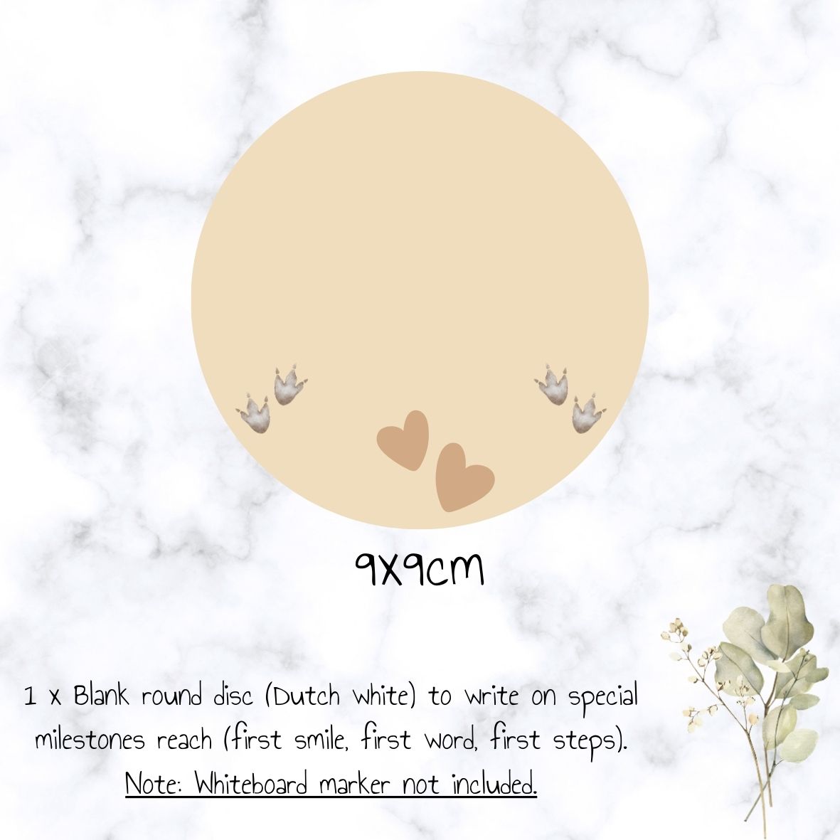 - 1 x Blank round disc (Dutch White) to write on special milestones reach (first smile, first word, first steps). Note: Whiteboard marker not included.