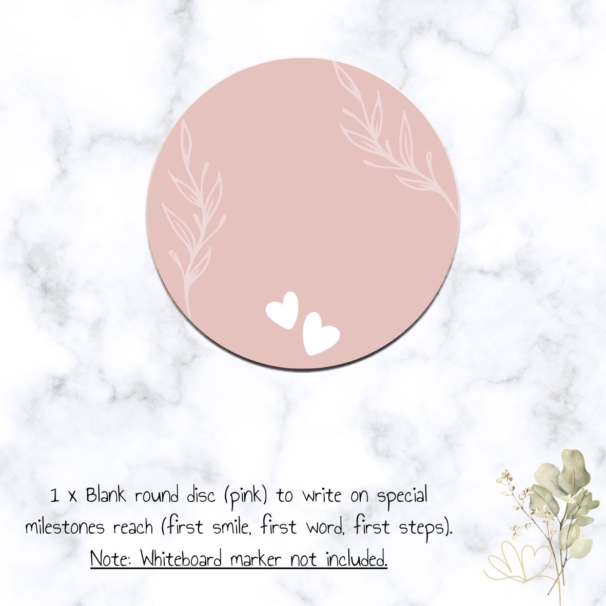 - 1 x Blank round disc (pink) to write on special milestones reach (first smile, first word, first steps). Note: Whiteboard marker not included.