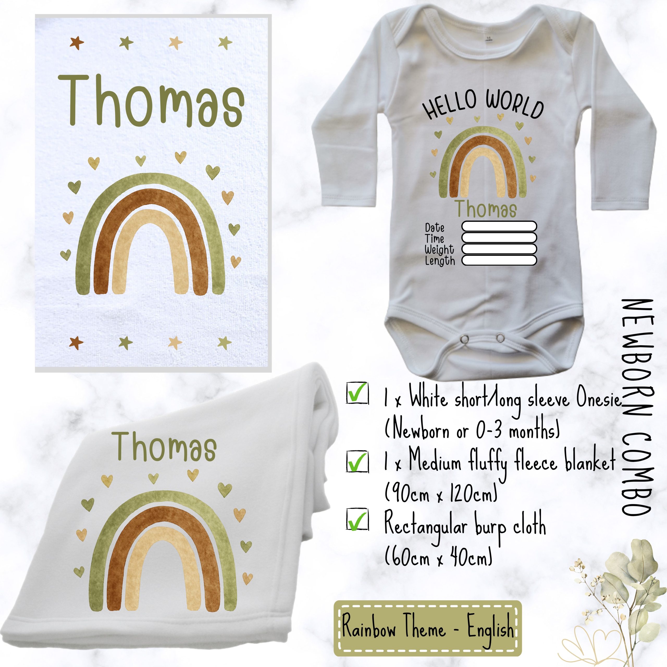 A beautiful rainbow-themed baby gift set including a custom printed onesie, fluffy fleece blanket, and matching burp cloth, neatly packed in a gift box.