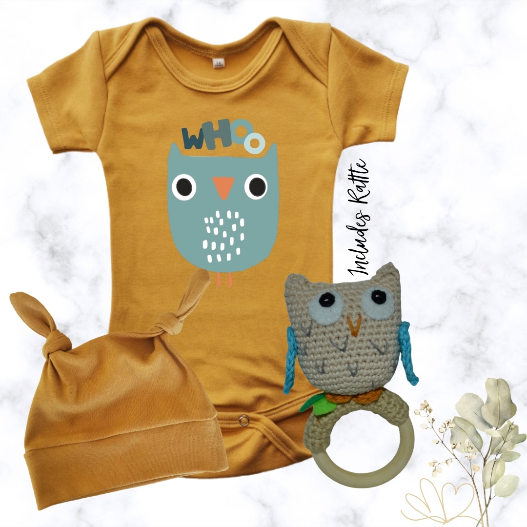 Whoo’s the Cutest? | Custom Printed Baby Onesie with a crochet teether/rattle and beanie. Made from soft, breathable cotton and Ready to Collect or Ship.